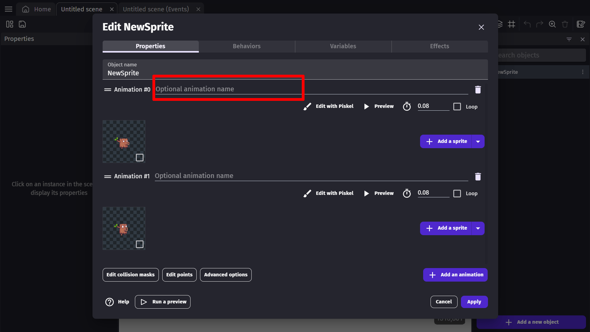 An animation allows you to add an image or series of images to the sprite object. To add an animation, click the Add an animation button.