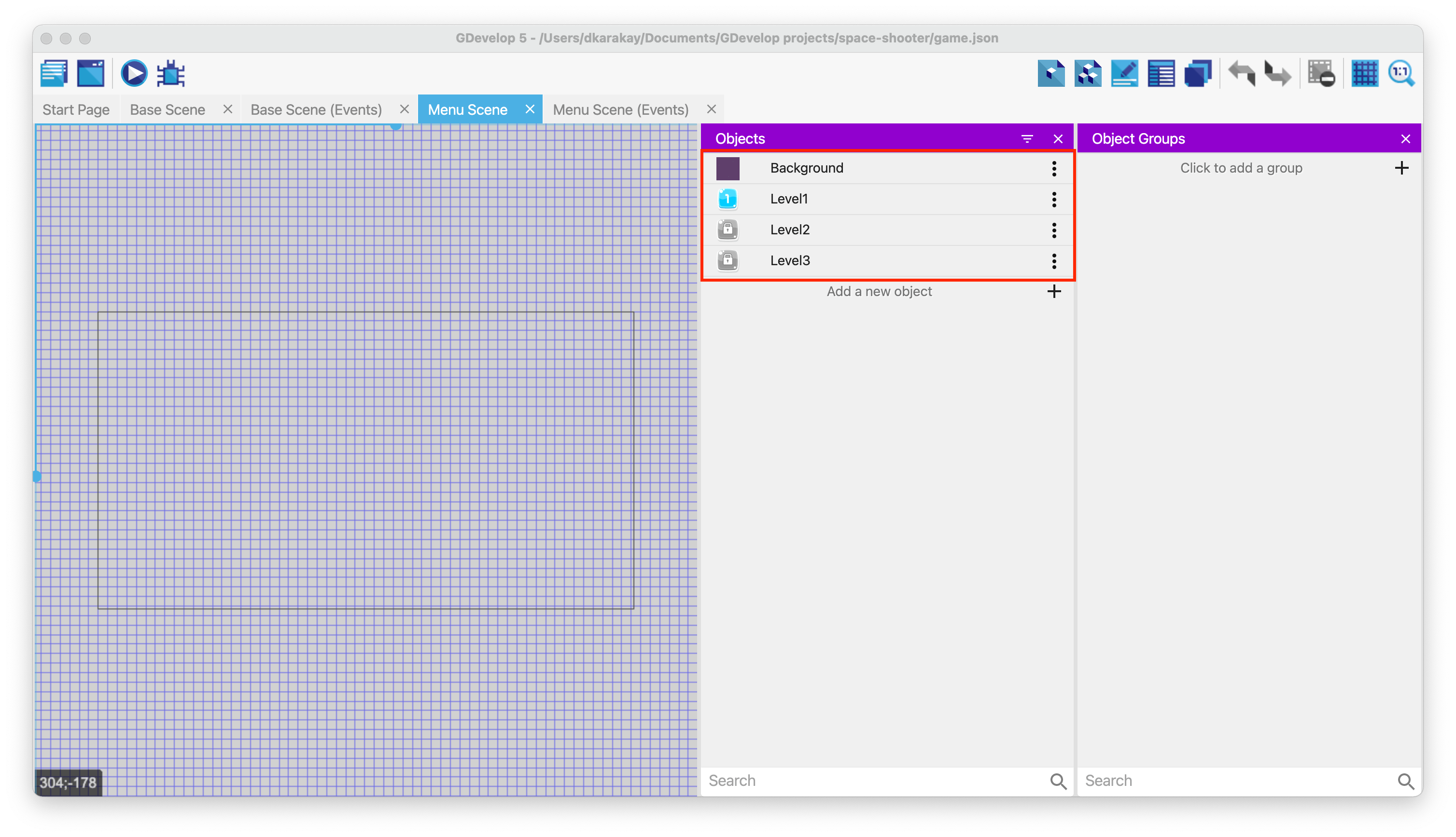 Then, create an object group for level objects called Levels.